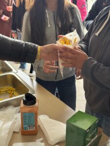 Schon früh am Morgen hatte Herr Böckmann mehrere professionelle Fritteusen aufgebaut und diese den gesamten Tag über im Einsatz. Mit viel Organisationstalent erstellte er im Vorfeld einen genauen Zeitplan, sodass jede Klasse nacheinander zum „Pommes-Stand“ kommen konnte und am Ende tatsächlich die gesamte Schülerschaft, das Kollegium und auch alle Mitarbeitenden der Schule mit einer Tüte Pommes versorgt waren.